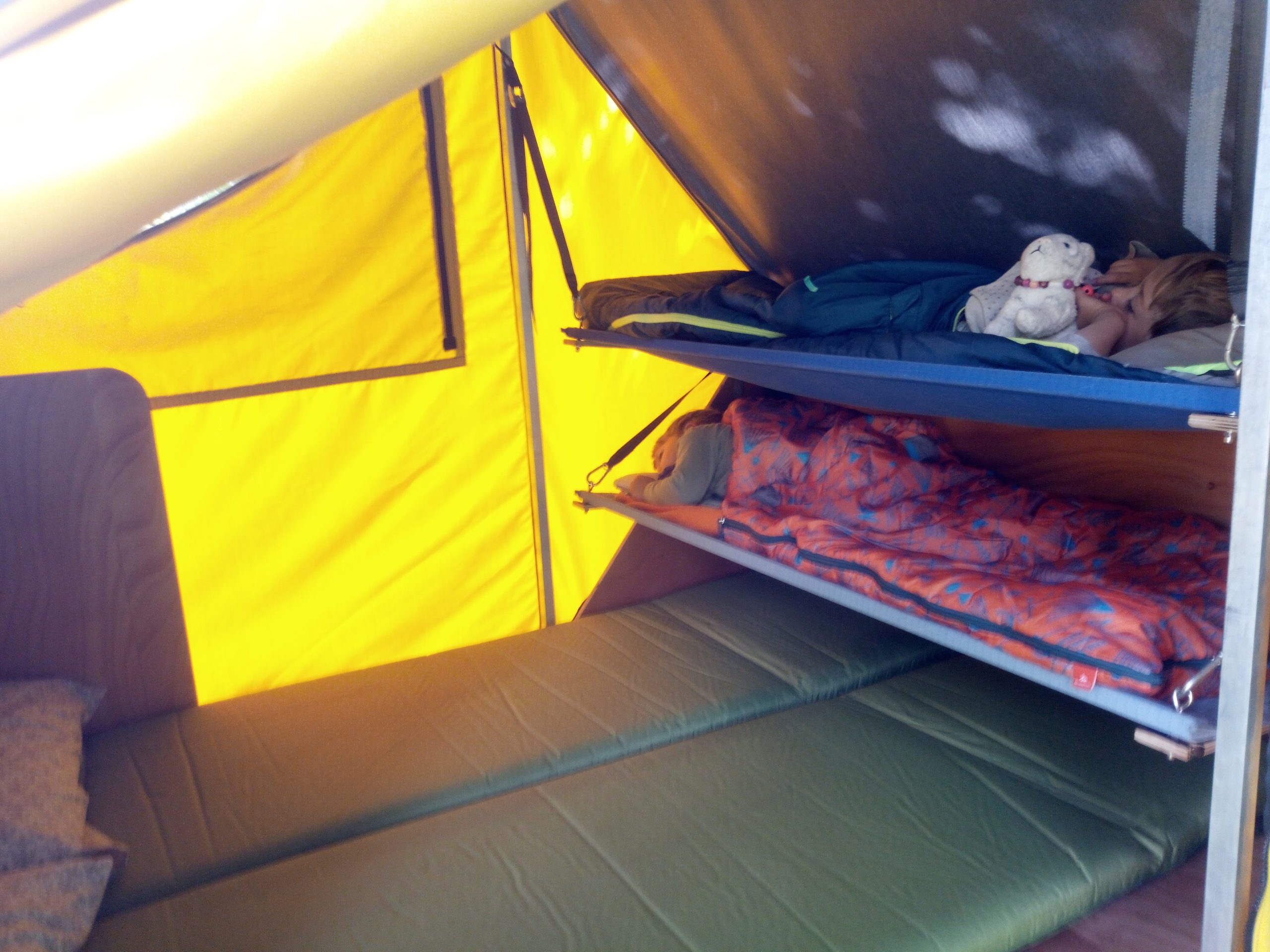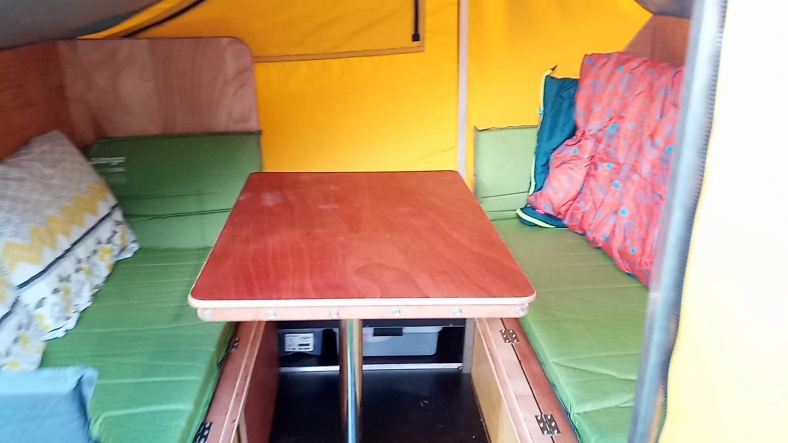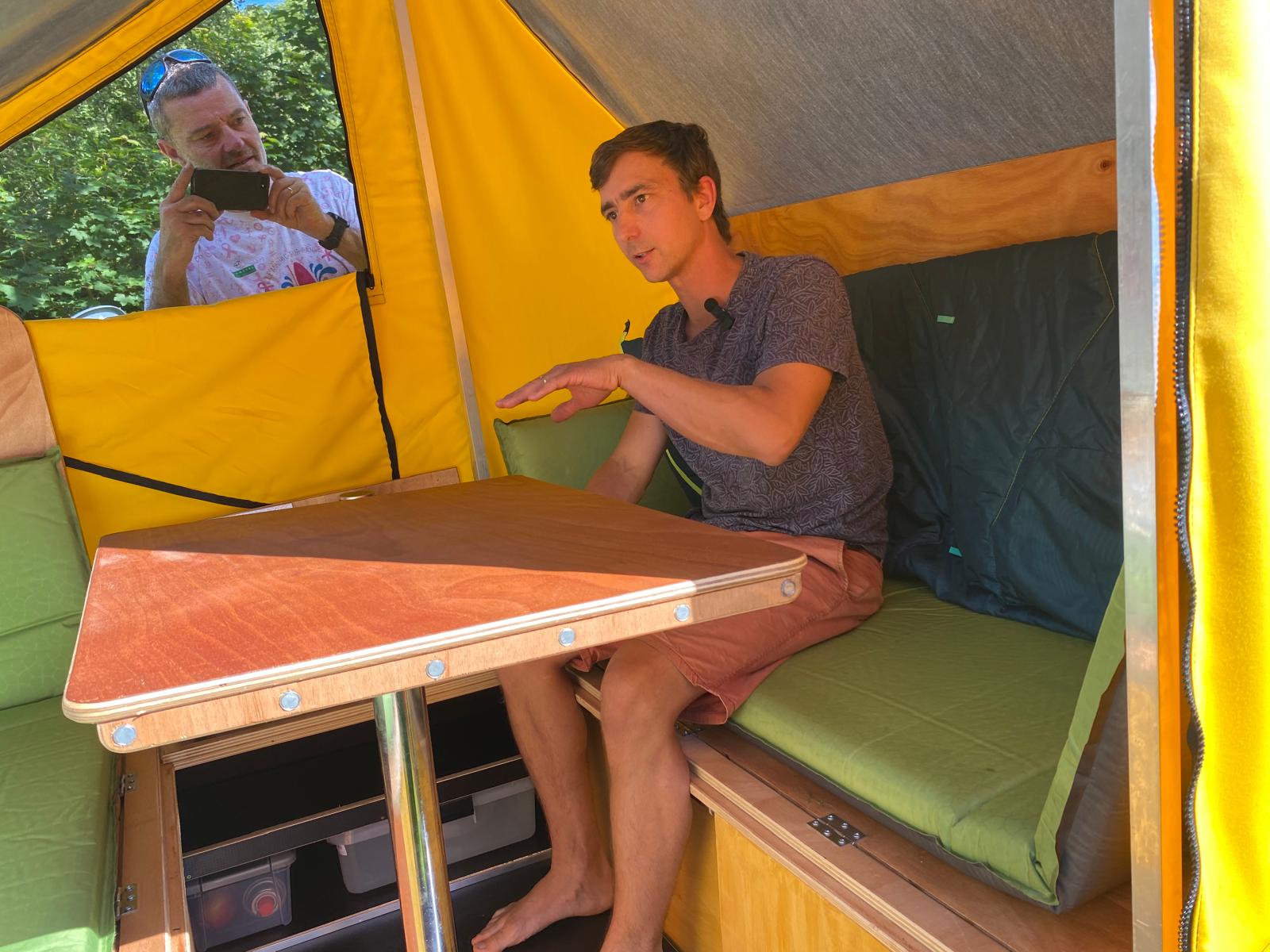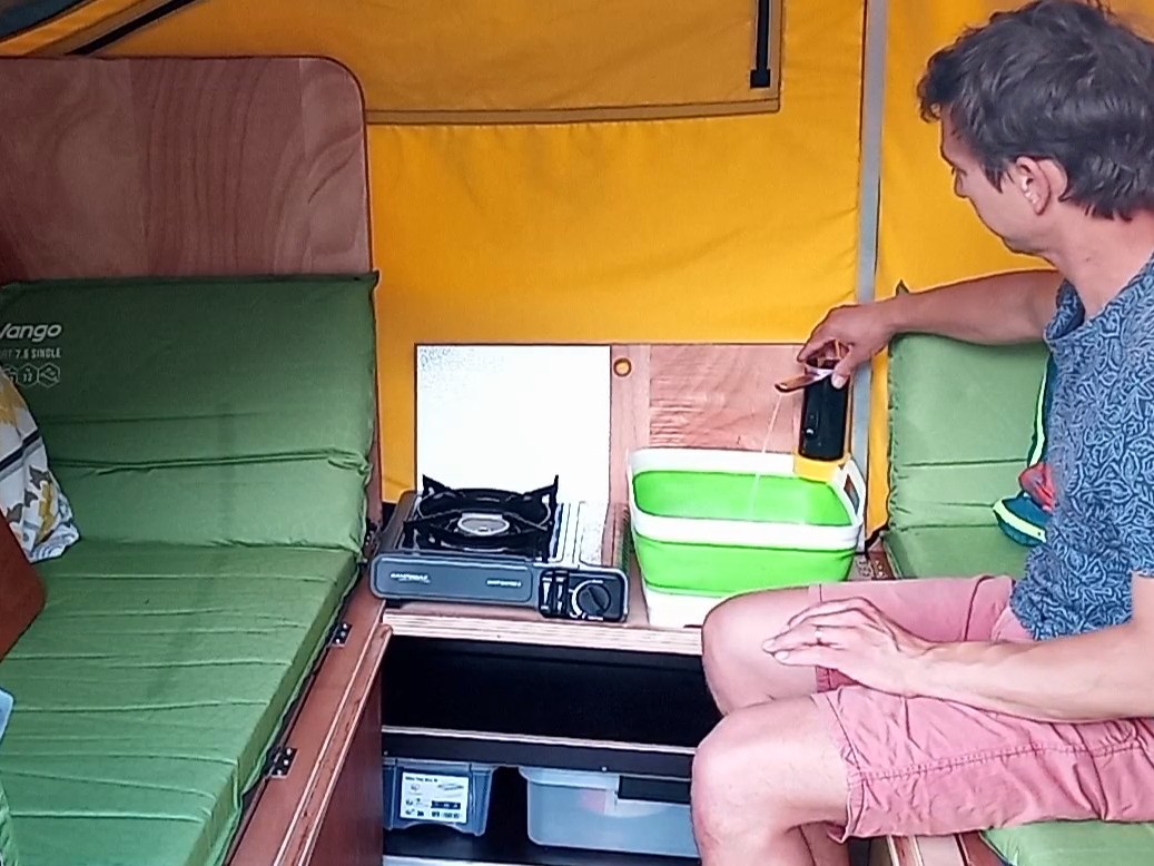 Elle permet de transporter du matériel (trois grosses caisses), dormir facilement à deux adultes et deux enfants, faire la cuisine à l’extérieur ou à l’intérieur et de manger à 4 bien à l’abri. Elle est égalent équipée de toilettes sèches pliables et d’un espace pour s’en servir.