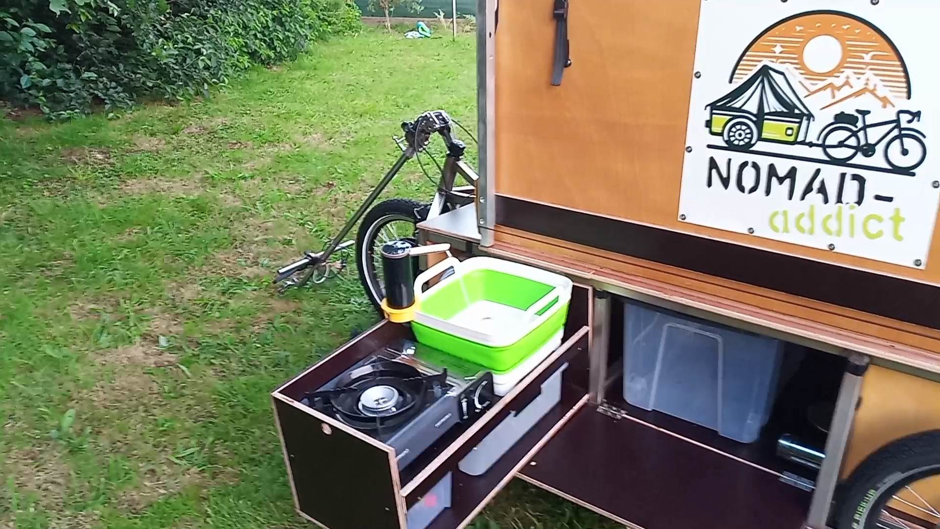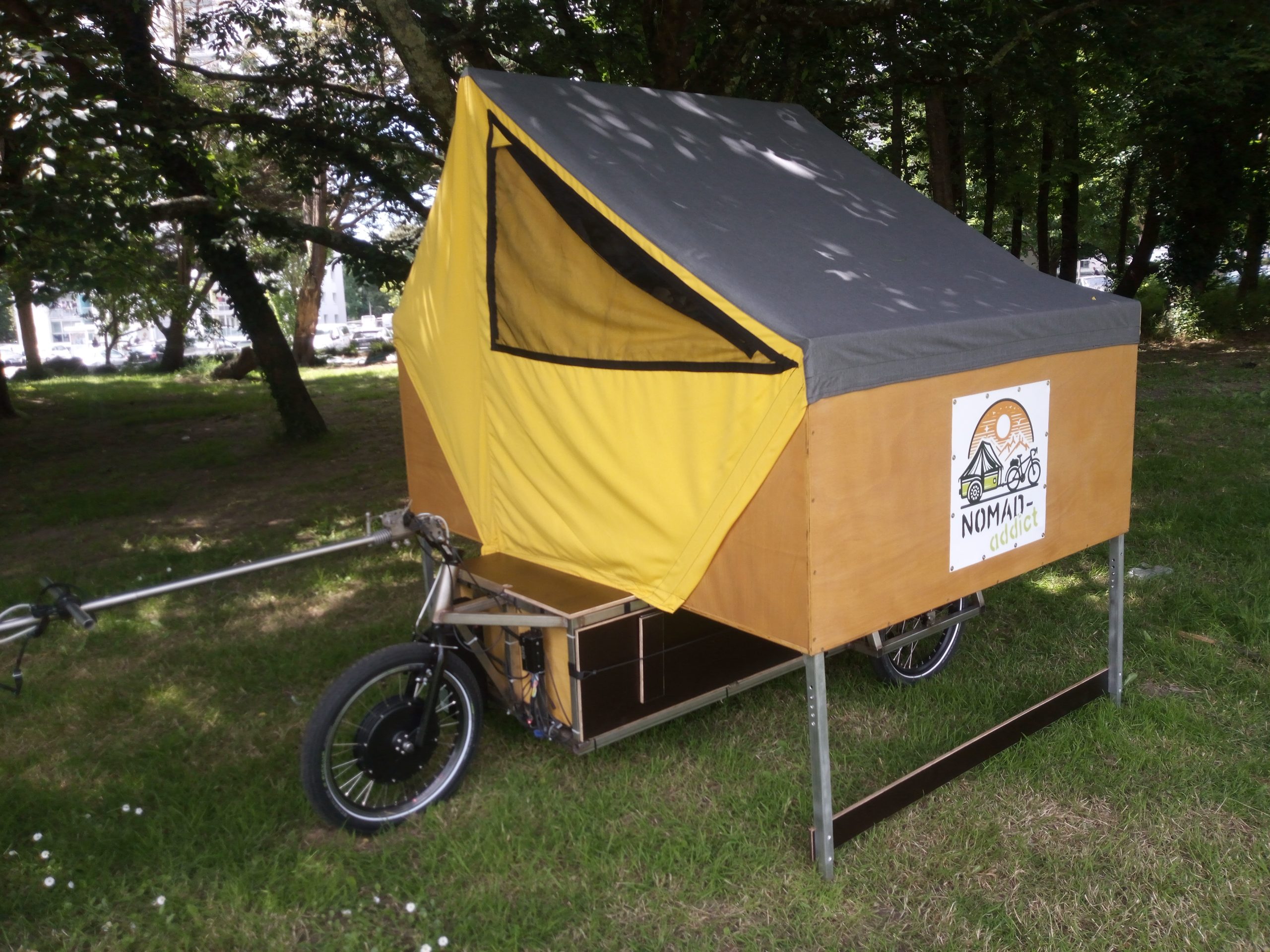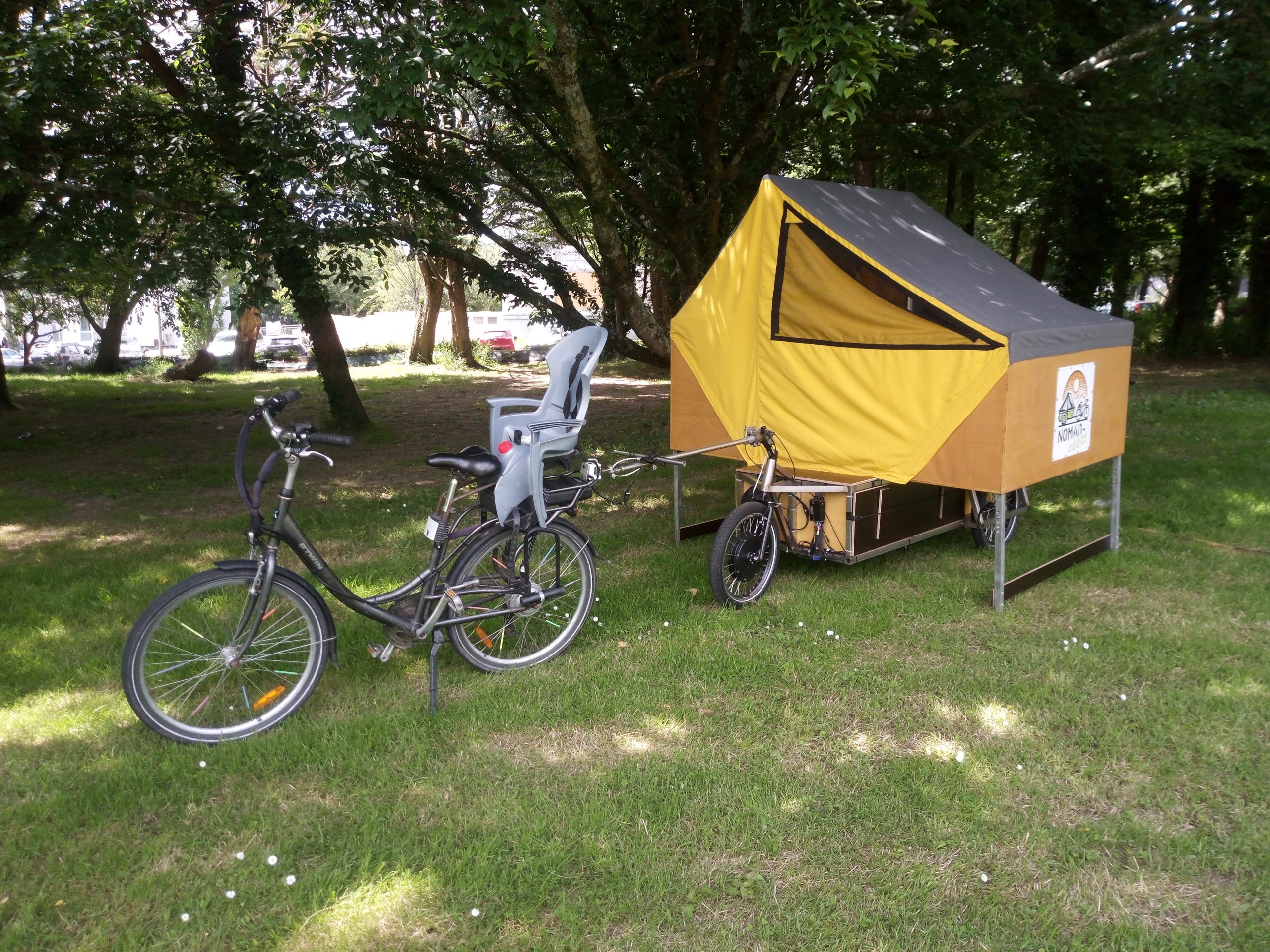 La « Charavane » est un une caravane tirée derrière un vélo, Elle s’installe sur la base de la « Charette » créée par Véloma.