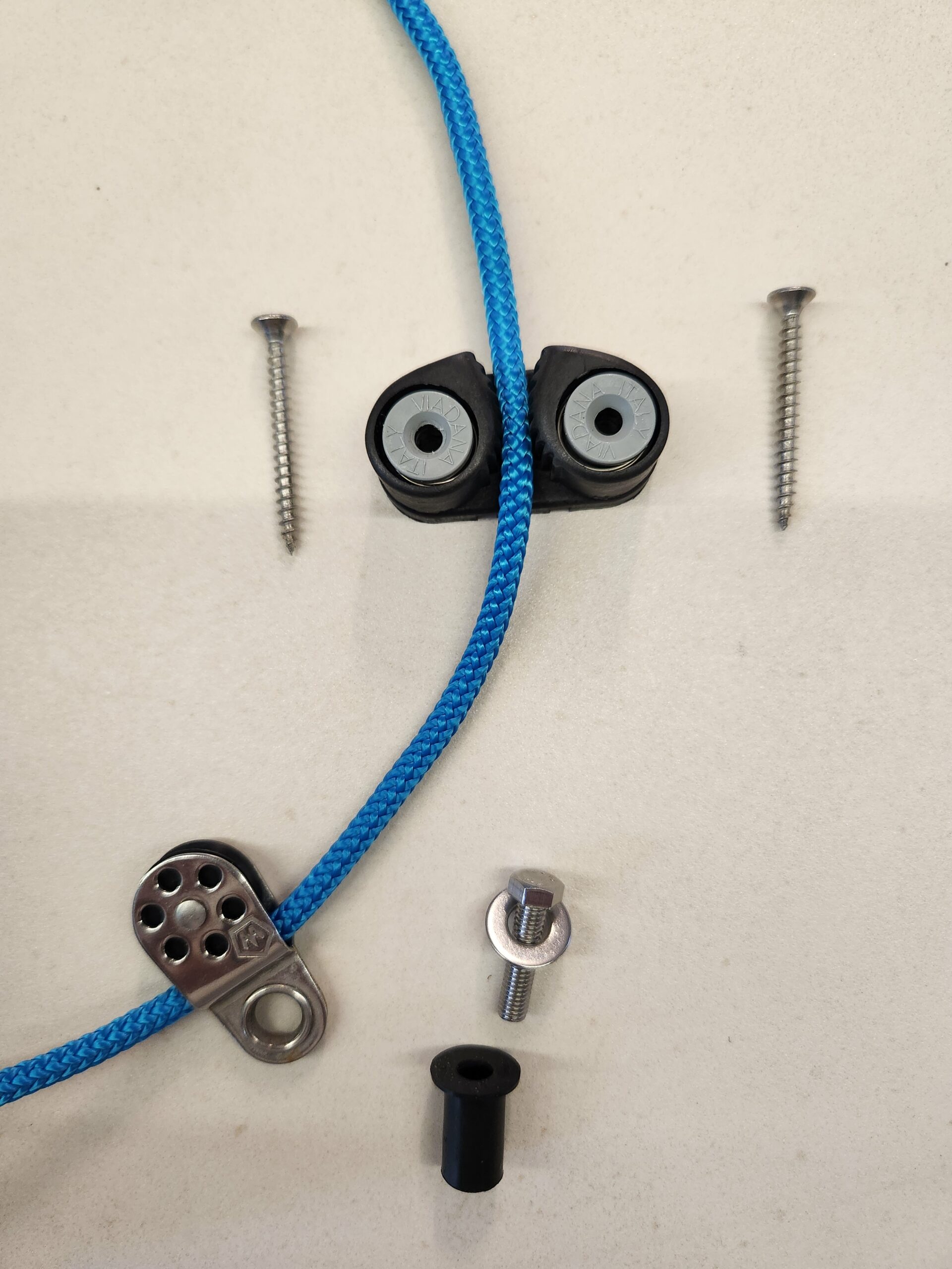 Comprend : Le kit d’enrouleur, son bout d’enroulage et son crochet de fixation voile, la poulie de renvoie avec insert et vis inox, un taquet coinceur avec visserie inox et le berceau de réception de voile avec système de visserie inox pour rail d’origine Hobie